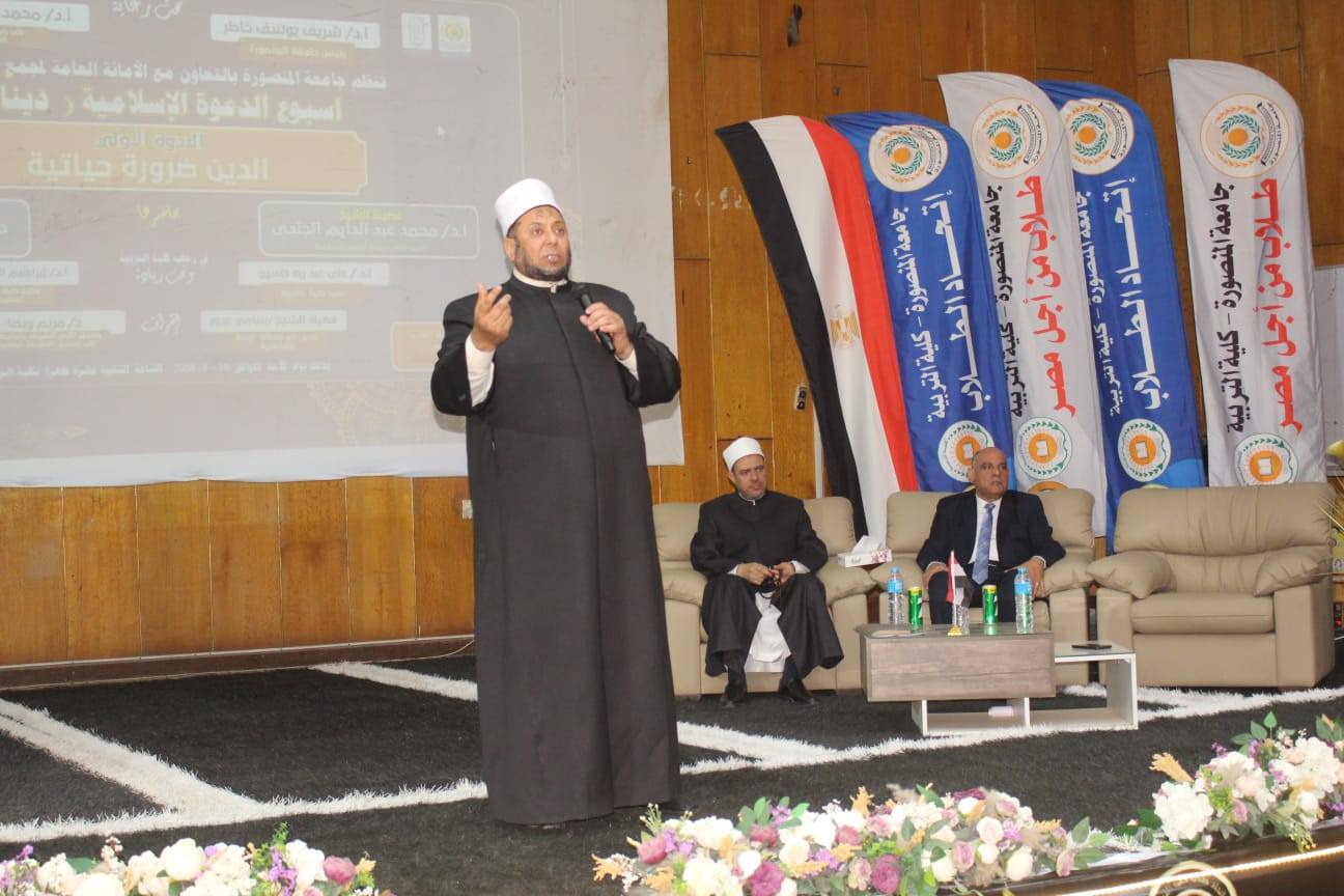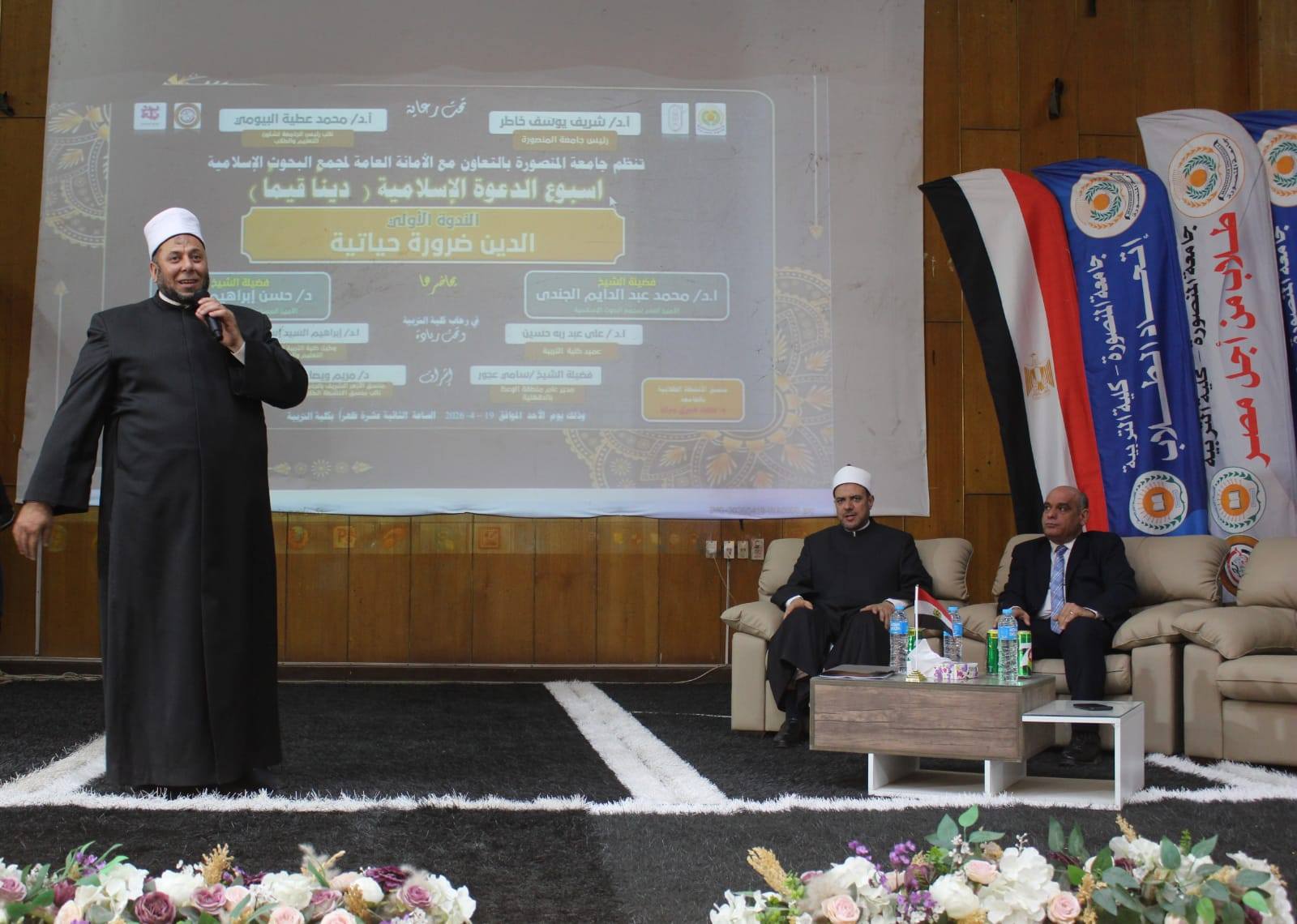 واستضافت كلية التربية بجامعة المنصورة أولى فعاليات الأسبوع، بعقد ندوة بعنوان «الدين ضرورة حياتية»، بحضور الدكتور علي عبد ربه، عميد الكلية، والدكتور عبد الله أبو شبانة، وكيل الكلية لشؤون خدمة المجتمع وتنمية البيئة، وفضيلة الدكتور حسن يحيى، الأمين العام المساعد للجنة العليا لشؤون الدعوة بمجمع البحوث الإسلامية، إلى جانب أعضاء هيئة التدريس، ونخبة من علماء الأزهر الشريف.